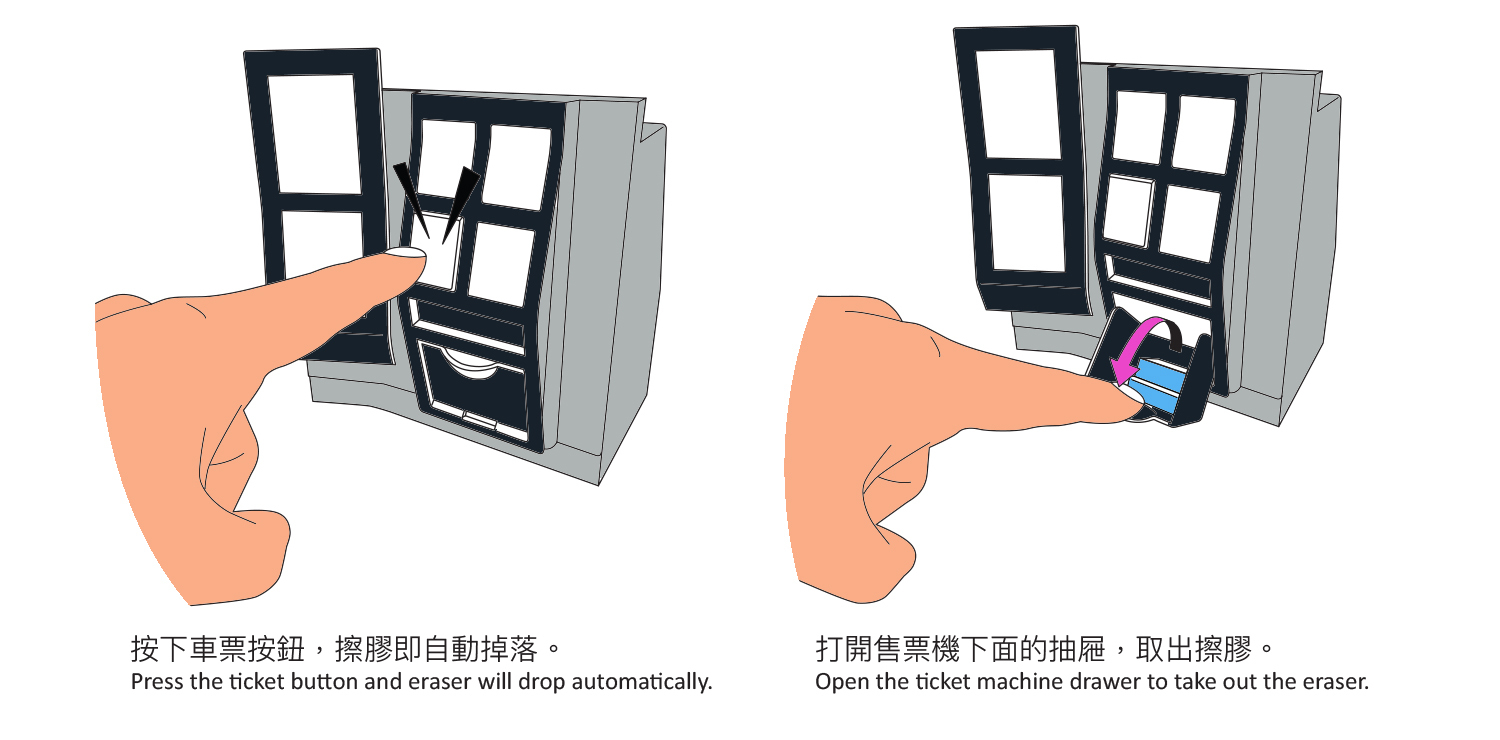 一體兩面的「售票機」,一面模仿70年代通車時的售票機,另一面模仿現時車站使用的「三合一」售票機。舊式「售票機」設計為一個便條紙收納;而新式「售票機」設計為一個迷你擦膠收納。