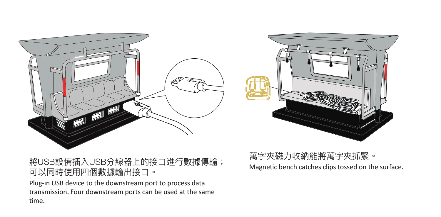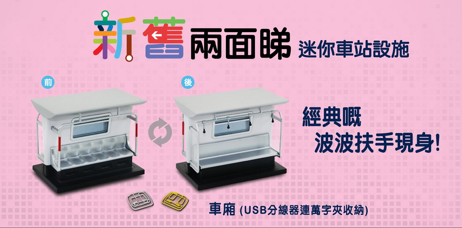 一體兩面的「車廂」USB 分線器及萬字夾收納,一面模仿第一代的列車車廂;而另一面側模仿現時常見的車廂。